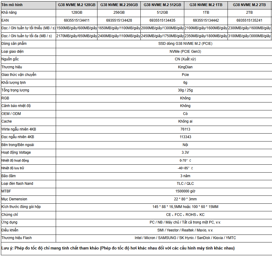 Ổ Cứng PCIe 3.0 NVMe M.2 KingDian G38 128Gb/256Gb/512Gb/1Tb – Hàng mới chính hãng – BH 36 tháng 1 đổi 1